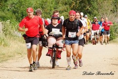 Donc à 17 h, s’élancent avant les coureurs valides qui leur font une haie d’honneur, comme à l’habitude, les sportifs handicapés accompagnés de leurs « joélistes » (coureurs-pousseurs ayant parfois un cœur plus gros et généreux que leurs mollets ….). Le record est à nouveau égalé avec la participation de 6 joélettes au départ. Ce ne sont pas moins de 42 joélistes qui partent pour ce (vrai) trail de 18 km. Michèle, Jean-Luc, Patrick, Sandra, Cyril et Fifi sont heureux de prendre ce départ sous la hola qui vient de se former. Ils boucleront le parcours pratiquement tous en près de 3h00, fatigués, des images plein les yeux, des rêves plein la tête, des émotions plein le coeur. Les sourires et les accolades échangées à l’arrivée entre les sportifs handis et leurs joélistes en disent très long sur ce qu’ils viennent de vivre, tous ensemble. Respect, partage, solidarité, courage, abnégation : voilà l’esprit de cet Aveyron-Handi-Trail qu’ACTION 12 a toujours voulu mettre en avant.